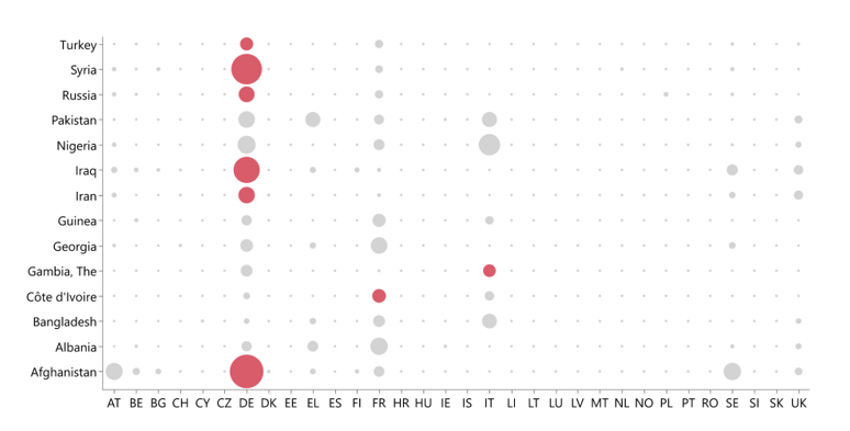 Notes: The size of the bubble indicates the number of decisions; red bubbles are those that represent one-half (or more) of all decisions issued to that citizenship.