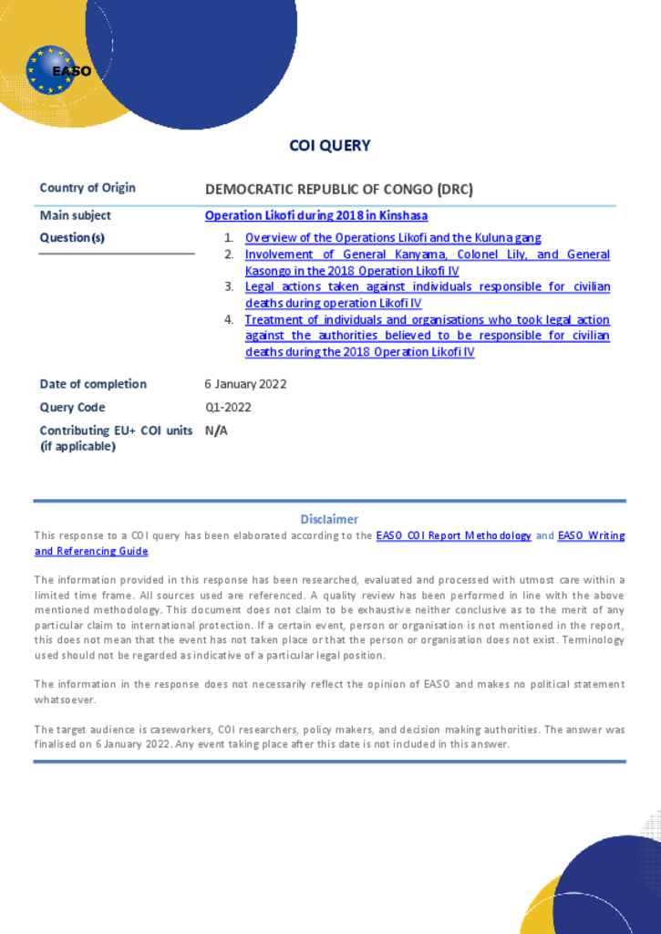 1. Overview of the Operations Likofi and the Kuluna gang; 2. Involvement of General Kanyama, Colonel Lily, and General Kasongo in the 2018 Operation Likofi IV; 3. Legal actions taken against individuals responsible for civilian deaths during operation Likofi IV; 4.