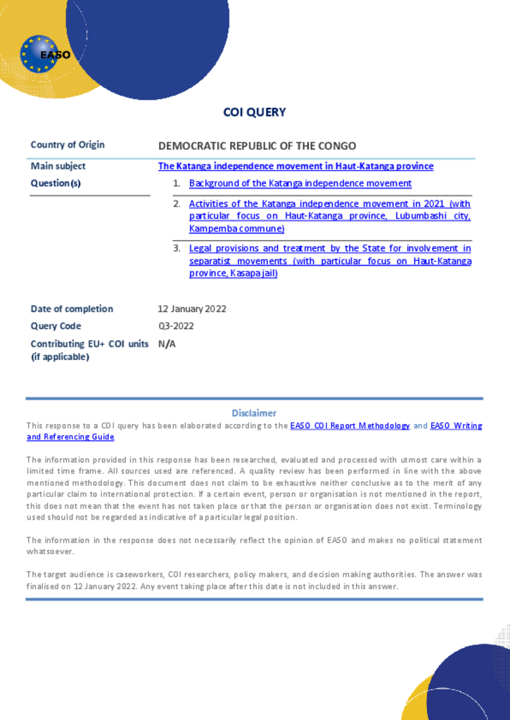 1. Background of the Katanga independence movement; 2. Activities of the Katanga independence movement in 2021 (with particular focus on Haut-Katanga province, Lubumbashi city, Kampemba commune); 3.