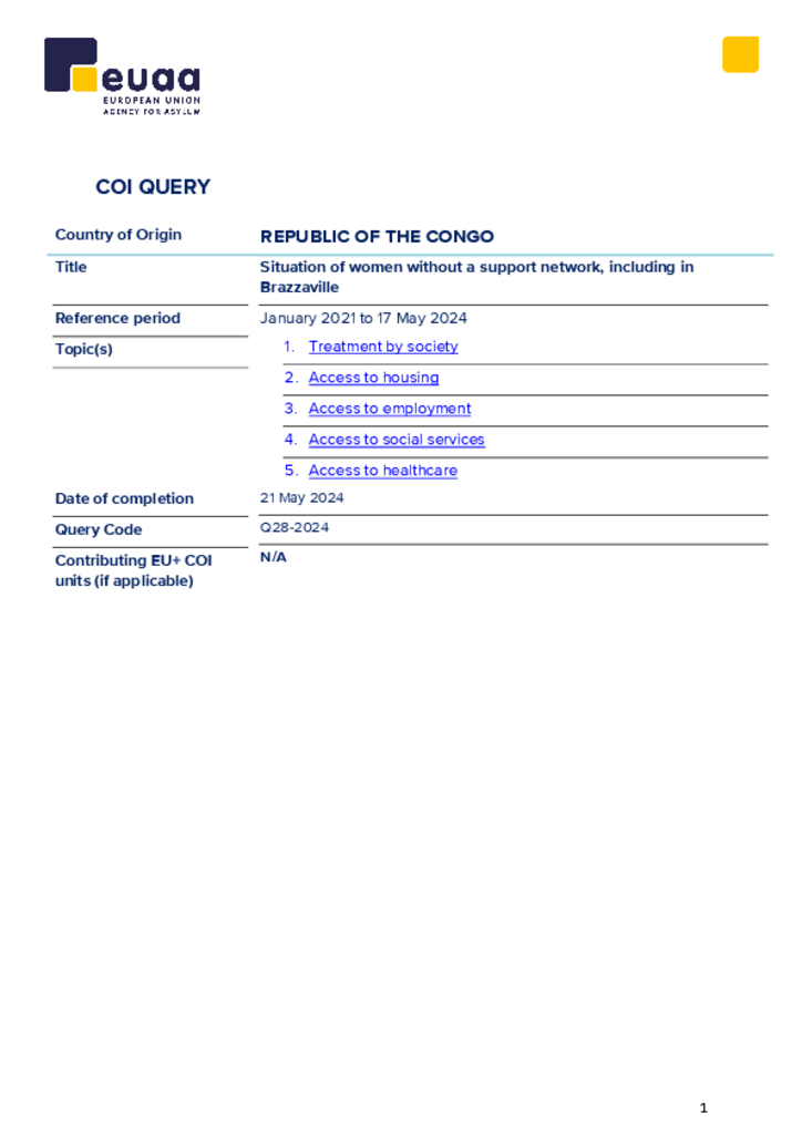 COI Query - Congo (Brazzaville): Situation of women without a support network, including in Brazzaville