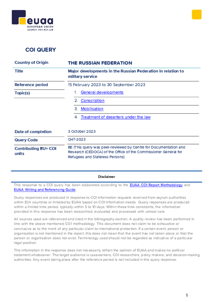 Reference period: 15 February 2023 to 30 September 2023; 1. General developments; 2. Conscription; 3. Mobilisation; 4. Treatment of deserters under the law.