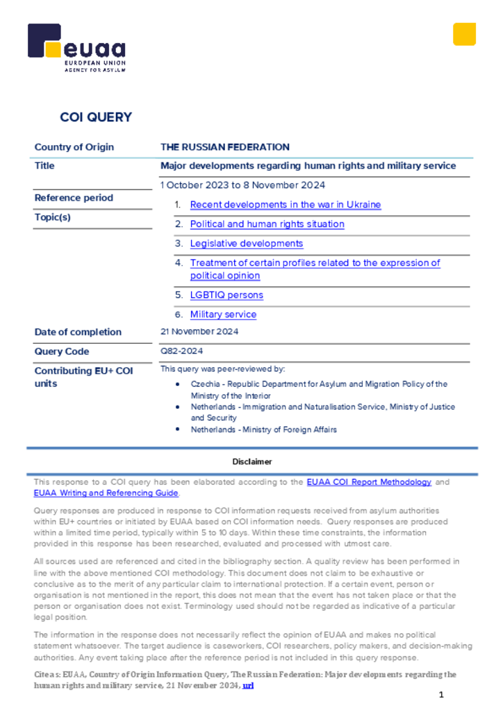 Reference period: 1 October 2023 to 8 November 2024; 1. Recent developments in the war in Ukraine; 2. Political and human rights situation; 3. Legislative developments; 4. Treatment of certain profiles related to the expression of political opinion; 5. LGBTIQ persons; 6. Military service.