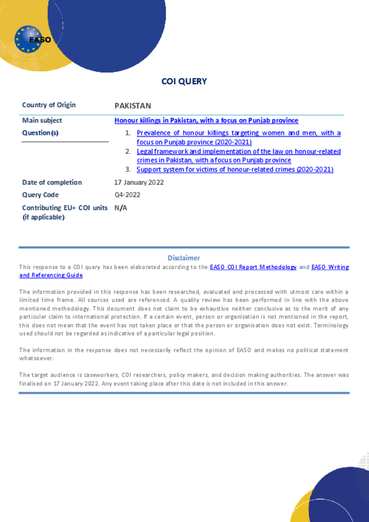 1. Prevalence of honour killings targeting women and men, with a focus on Punjab province (2020-2021); 2. Legal framework and implementation of the law on honour-related crimes in Pakistan, with a focus on Punjab province; 3. Support system for victims of honour-related crimes (2020-2021).