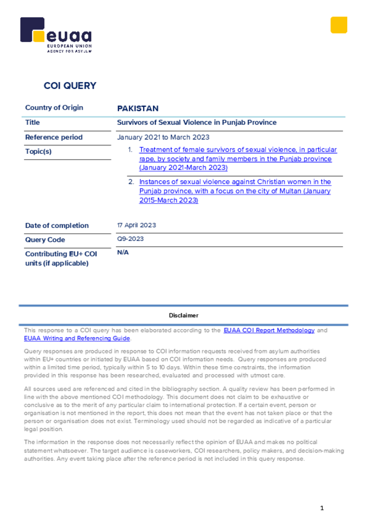 Reference period: January 2021 to March 2023; 1. Treatment of female survivors of sexual violence, in particular rape, by society and family members in the Punjab province (January 2021-March 2023); 2.