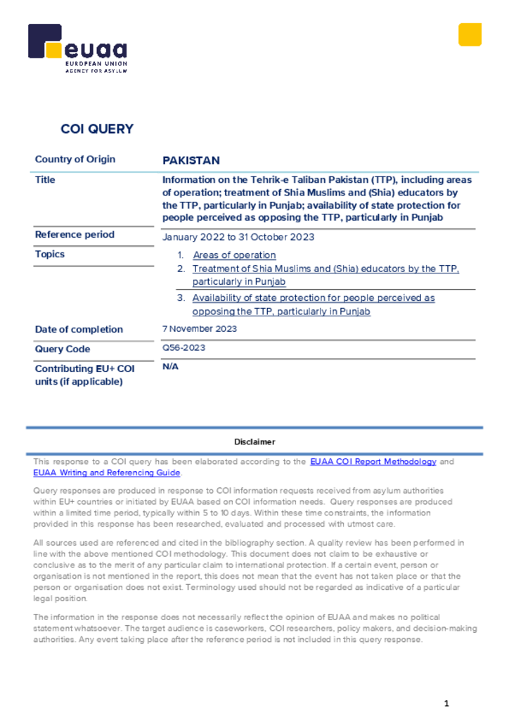 Reference period: January 2022 to 31 October 2023; 1. Areas of operation; 2. Treatment of Shia Muslims and (Shia) educators by the TTP, particularly in Punjab; 3. Availability of state protection for people perceived as opposing the TTP, particularly in Punjab.