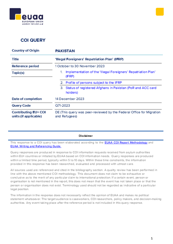 COI Query - Pakistan: ‘Illegal Foreigners’ Repatriation Plan’ (IFRP)
