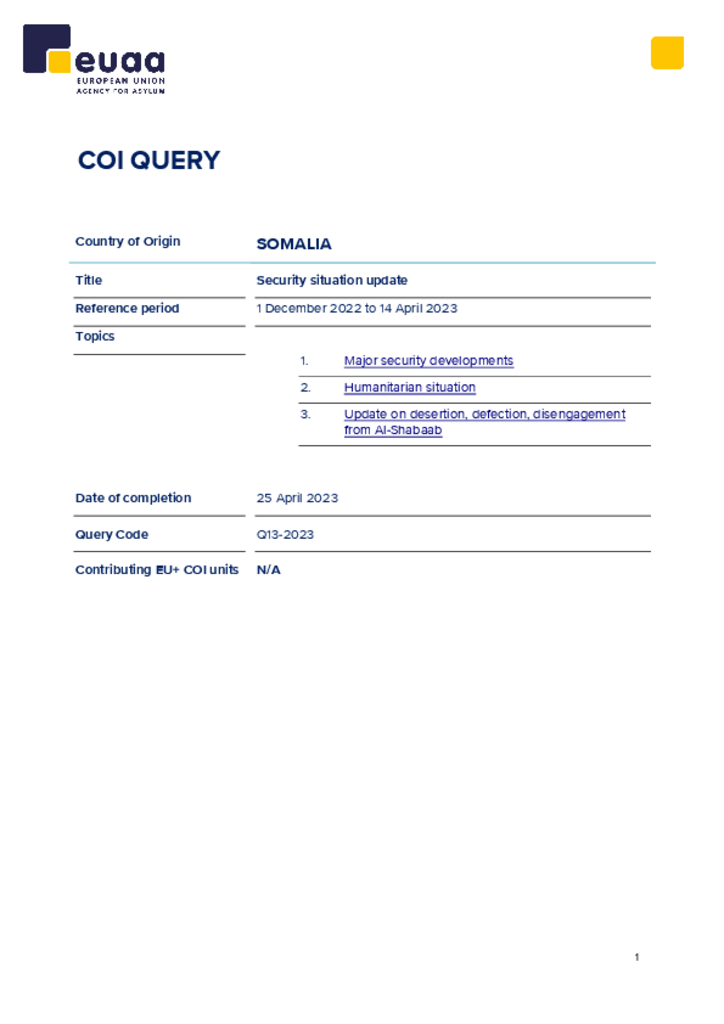 Reference period: 1 December 2022 to 14 April 2023; 1. Major security developments; 2. Humanitarian situation; 3. Update on desertion, defection, disengagement from Al-Shabaab.